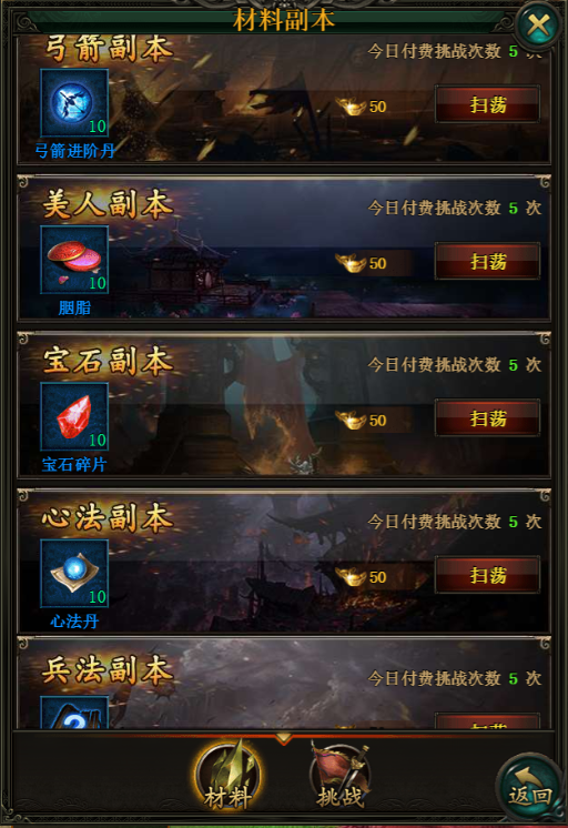 弓箭副本、美人副本、宝石副本、心法副本、兵法副本共五个副本,完成指定关卡任务即可开启副本玩法。